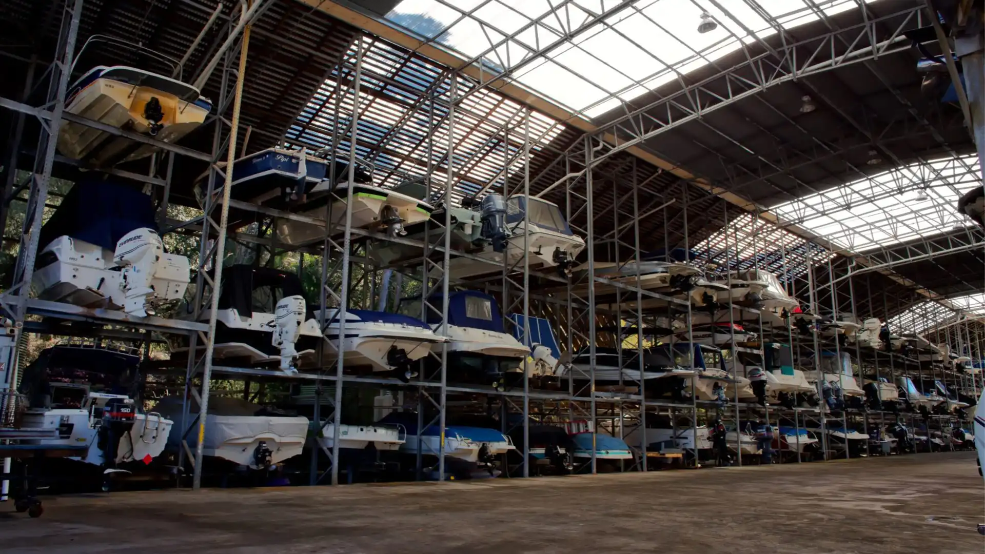In this setup, boats are stacked on racks in the open air. While they’re kept off the ground and protected from theft or vandalism, they’re still exposed to sun, rain, and wind. Outdoor dry stack is generally less expensive than indoor options, with rates starting around $150 to $300 per month, depending on boat size and marina location. It’s a good balance of security and affordability, but owners will still need to keep up with covers and maintenance to guard against UV and weather-related wear.