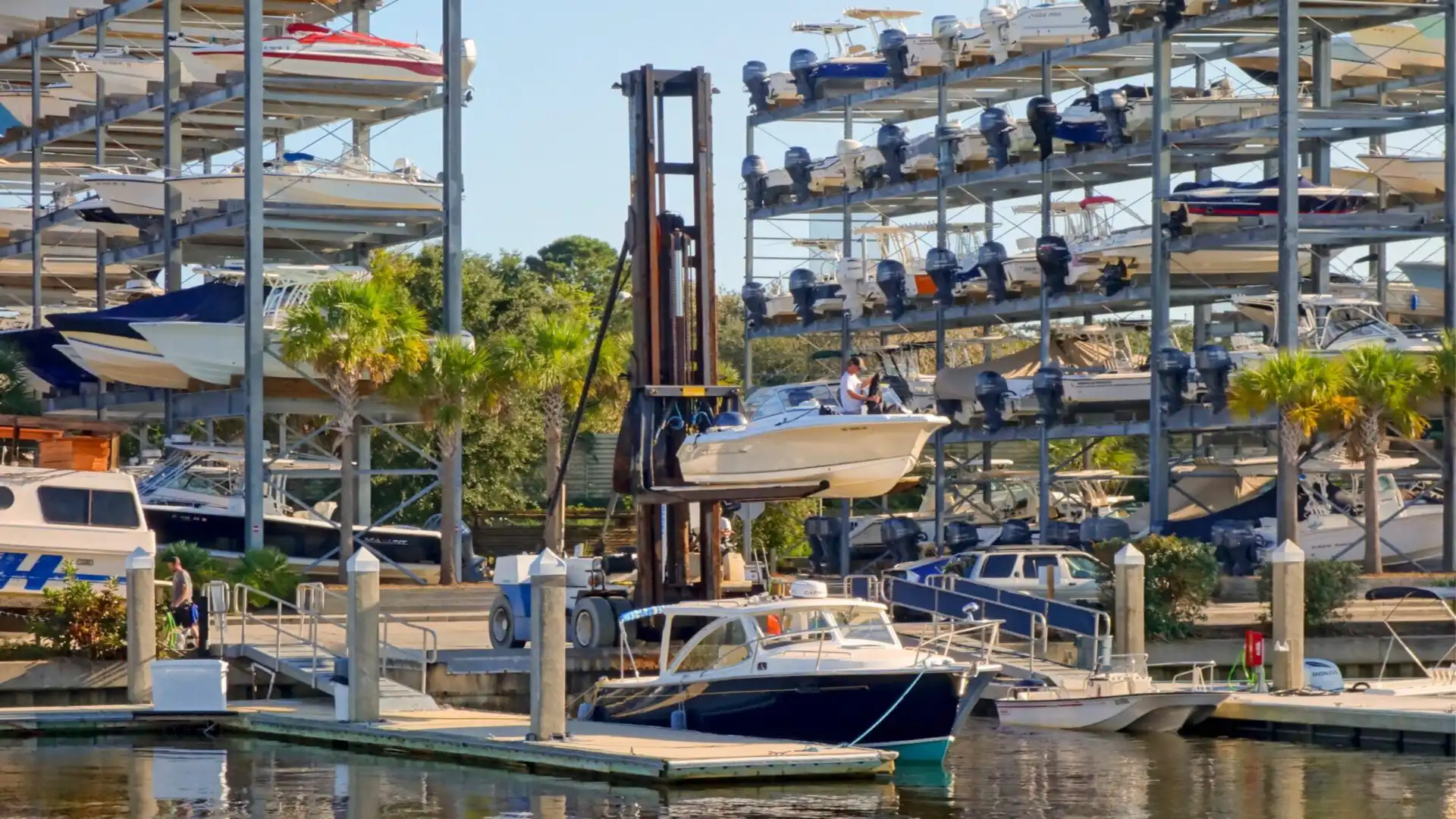 Most facilities handle boats up to about 30–35 feet, but some marinas with heavy-duty forklifts and tall racks can accommodate boats up to 40 feet. Anything larger typically requires wet slip storage.
